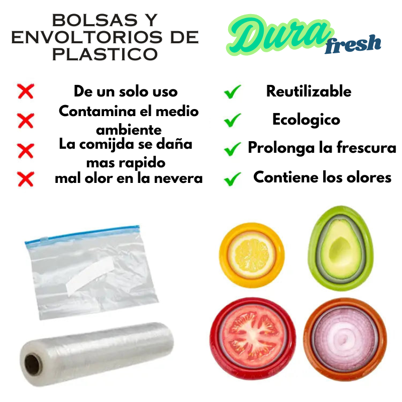 No importa el tamaño o la forma de tus productos, las DuraFresh se adaptan a todo. Su material elástico cubre perfectamente desde un aguacate hasta una cebolla, brindándote la solución ideal para guardar tus alimentos.